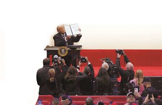 ■1月20日,在美国首都华盛顿第一资本体育馆,美国总统特朗普展示其签署的行政令。新华社发