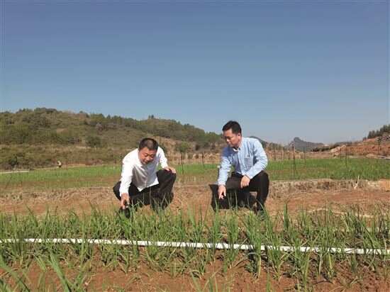 ■傅晓峰(右)在田间地头研究如何推动三排农业产业发展。
