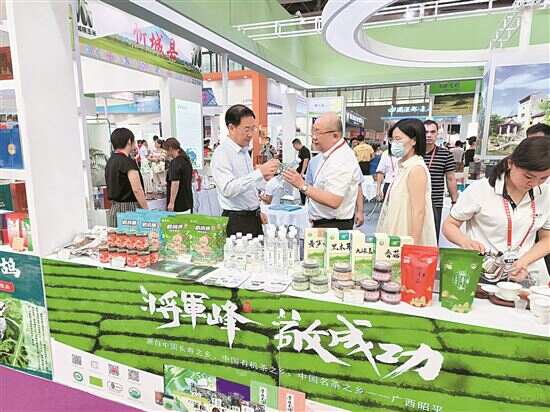 ■在广州举行的县博会上,黄捷(中)向广东省农业农村厅相关负责人介绍“昭平水”。