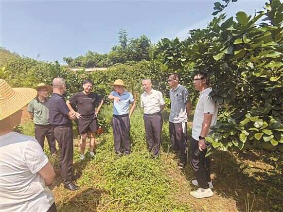 ■杨国亨(右一)与农业科技特派员在乔庄村柚橙种植基地做调研。