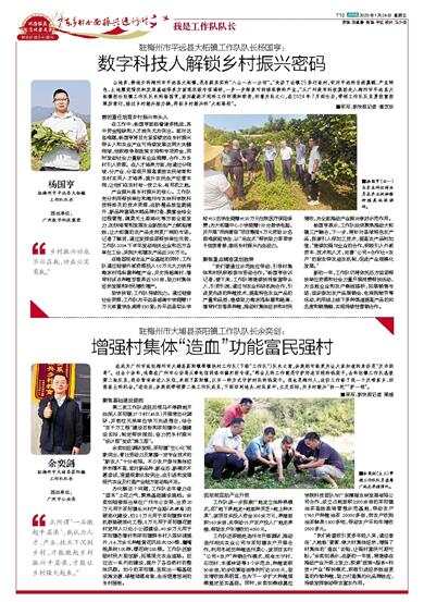 山地多、耕地少的梅州市平远县大柘镇,是名副其实的“八山一水一分田”。“走访了全镇25条行政村,针对平远的自然禀赋、产业特色、土地撂荒情况和发展基础等多方面现况做专项调研,一步一步探索可持续深耕的产业。”从广州数字科技集团走入梅州市平远县大柘镇担任驻镇工作队队长的杨国亨,面对截然不同的工作环境和职责,怀着为民之心,在2024年7月到任后,带领工作队队员勇担重担踔厉前行,接过乡村振兴接力棒,再拓乡村振兴的“大柘路径”。