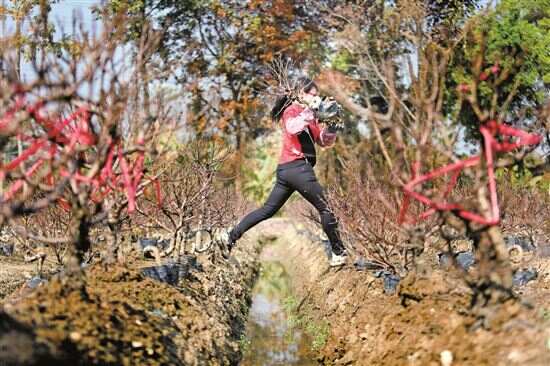 石马村还有少数年轻人会在春节前后回家帮着老人卖桃花,这位女村民健步如飞,在田间跳来跳去。