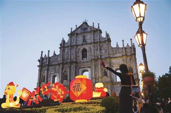 春节临近,澳门特区市政署在澳门各区布置“金蛇贺岁喜迎春”主题的贺年灯饰,营造浓厚的过年节庆氛围。图为1月25日在澳门大三巴牌坊前拍摄的春节灯饰。新华社发