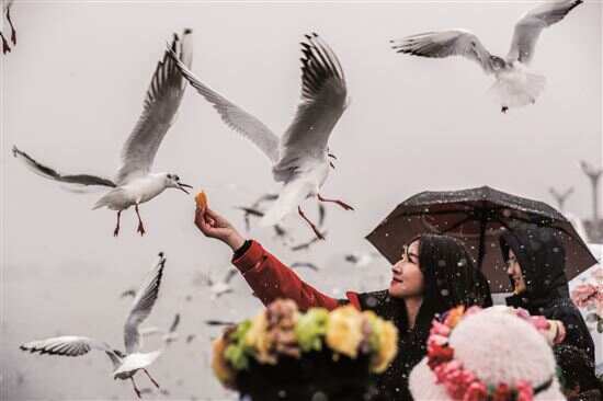 受寒潮影响,1月27日,“春城”昆明迎来降温降雪天气,游人在昆明市海埂大坝喂食红嘴鸥。新华社发