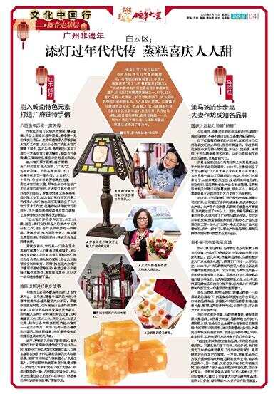 逢年过节,“张灯结彩”总成为描述节日气氛的高频词。在传统的岭南祠堂,过年添灯寓意家族“添丁”,有着更重要的意义。广式红木宫灯制作技艺是省级非物质文化遗产,白云区江高镇是发源地之一,如今,红木宫灯在新一代传承人的坚守和创新下,成为民间民俗节日的时尚礼品,飞入寻常百姓家。江高镇的马蹄糕也是知名广式美食,广式马蹄糕制作技艺是白云区区级非遗代表性项目,从传统马蹄糕,到苦瓜马蹄糕、咖啡马蹄糕……从街头小吃到手信礼盒,马蹄糕甜蜜的味道已经传遍了海内外。