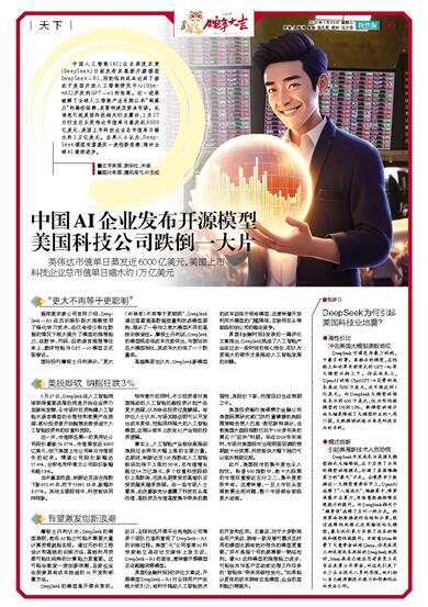 中国人工智能(AI)企业深度求索(DeepSeek)日前发布其最新开源模型DeepSeek-R1,用较低的成本达到了接近于美国开放人工智能研究中心(OpenAI)开发的GPT-o1的性能。这一进展破解了全球人工智能产业长期以来“堆算力”的路径依赖,其影响波及资本市场。此消息引起美国科技相关行业震动,1月27日行业巨头英伟达市值单日蒸发近6000亿美元、美国上市科技企业总市值单日缩水约1万亿美元。业界人士认为,DeepSeek模型有望激发一波创新浪潮,推动全球AI继续进步。