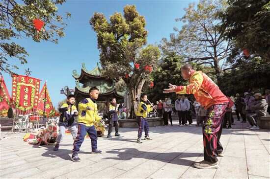 目前,黄阁镇内共有黄阁麒麟队、大塘村和乐社、东里村同庆社、莲溪村崇乐社、大井村健身社等麒麟队伍。当天,记者看到麦炽鸿正在开展麒麟舞教学展示,小朋友们身着鲜艳的麒麟服饰,一招一式虽稍显稚嫩,却充满了活力与朝气。“现在麒麟舞不仅在黄阁镇传承,还在周边地区得到了广泛推广。希望通过这些努力,让麒麟舞这一非物质文化遗产代代相传,永葆活力。”
