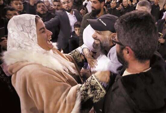 据新华社电 1月30日,在约旦河西岸城市拉姆安拉,人们拥抱获释的巴勒斯坦人。