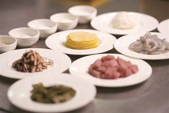 馅料优选新鲜食材,其中猪肉不宜选腩肉或臀肉,这些部位的肉相对比较韧;肥肉在整个馅料中的占比要占到四分之一,也就是25%左右;瘦肉和虾肉的比例则不固定,调好的馅料需要不断顺一个方向搅拌至起胶,然后冷藏一段时间,包制前再加入葱白一味。