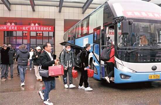 2月1日,在武胜县客运站,外出务工人员登车前往广东返岗就业。当日,四川省广安市武胜县110名务工人员登上开往广东的返岗专车,将“一站式”抵达在粤各地工厂。这是当地春节后发出的首趟返岗务工专车,助力务工人员顺利返岗。(新华社)