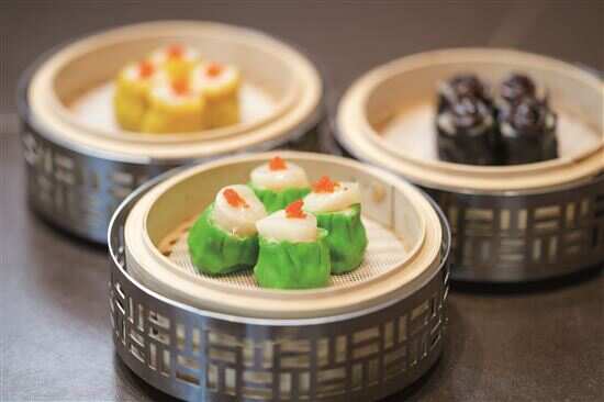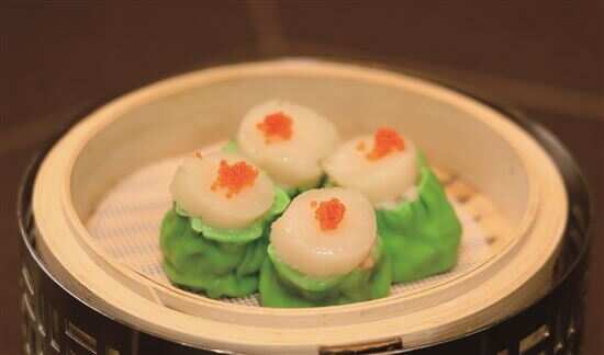 一款碧绿润白的“翡翠澳带烧卖”,“翡翠”指根据时令季节考量于面粉中加入菠菜汁和面而成的碧绿色烧卖皮,面上覆一枚如铜钱般大的澳洲带子,观之即有“温润如玉”之感。