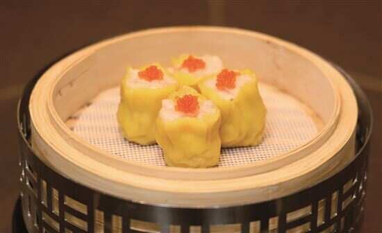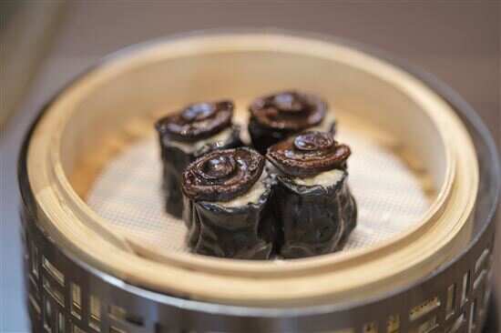 ■鲍鱼烧卖皇,选用原只小鲍鱼,烧卖皮当中专门加入墨鱼汁,与鲍鱼的深褐色相呼应。