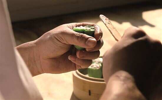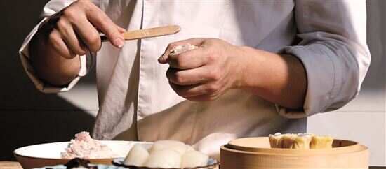 这个加温过程看似简单,实际上执行到位并不容易,已从业二十多年的南海渔村·徐博馆厨师长卢兆哲就特别强调火候的控制很重要,并且与所蒸制的烧卖大小及馅料也有关联,还有一个关键是蒸好后不要立即开盖,需要让烧卖继续静置几分钟再取出,这样不会塌皮。