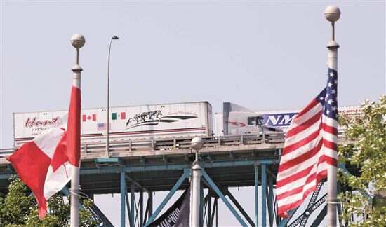 ■在加拿大安大略省温莎市,一辆印有墨西哥、加拿大与美国国旗的长途货车(左)通过大使桥开往美国。