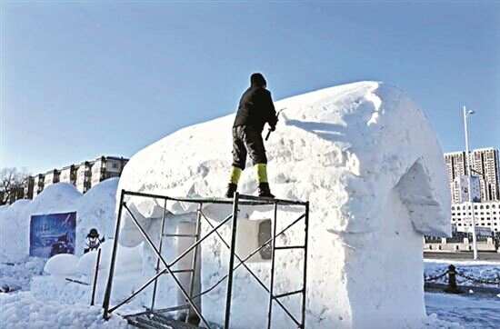 ■打造雪雕的过程,需要在雪坯上从上至下雕刻(牡丹江市工艺美术协会供图)。