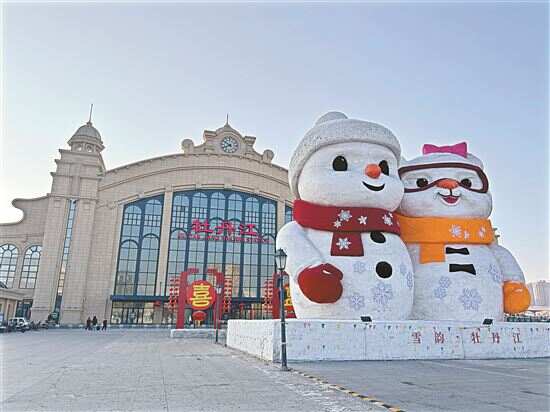 ■牡丹江站北广场前15米高的两个雪人。