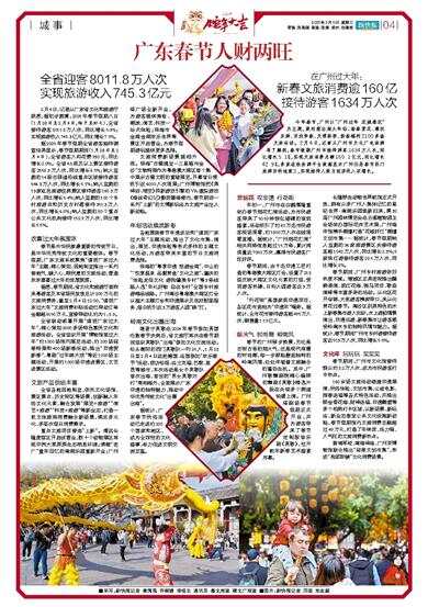 今年春节,广州以“广州过年 花城看花”为主题,策划推出烟火年俗、踏春赏花、潮玩乐游、百戏争春、文博新彩、新春福利2100多场文旅活动。2月4日,记者从广州市文化广电旅游局了解到,春节假期广州市接待游客1634万人次,同比增长5.1%,实现文旅消费总额160.1亿元,同比增长42.9%,多家在线旅游平台数据显示广州位居春节热门旅游目的地前三,实现接待人数与经济收入双增长。