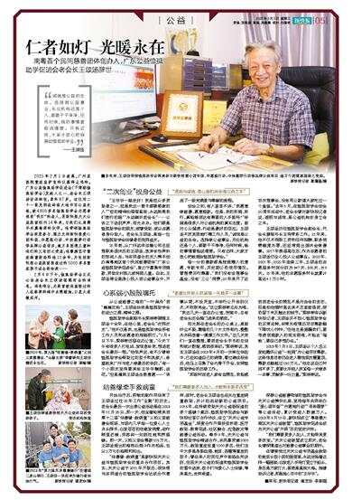 2025年2月1日凌晨,广州某医院重症监护室的仪器停止鸣响。广东公益恤孤助学促进会(下简称恤孤助学会)发起人之一、老会长王颂汤安详辞世,享年87岁。这位用二十一载光阴在岭南大地书写公益长卷,被4800多名恤孤助学会志愿者视若“明灯”的老人,是新快报天天公益版面创刊14年来,与我们比肩携手共襄善举的伙伴。他带领恤孤助学会深度参与、强力支持新快报爱心团年饭、许愿瓶行动、中秋圆梦行动等品牌公益项目,逾万名困境儿童和他们的父母因之受益;他擎旗坚守重症病童救助阵地10余年,为包括新快报公益版面报道过的5000多名重症孩子送去救命款……