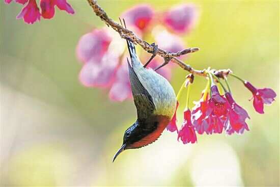 ■樱花与鸟儿“相映成趣”。