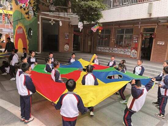 越秀区小北路小学从去年秋季学期开始已对课间15分钟开展积极探索。学校5个校区着力打造趣味课间、运动课间、活力课间、智慧课间,活动项目有体育类、益智类、趣味游戏类等。此外,为推行广府文化特色,各校区第三节课间播放如《落雨大》《爱莲说》《我到海边多欢笑》等耳熟能详的粤语童谣,孩子们站在操场上自己最喜欢的地方,边活动边大声跟着唱,将欢乐氛围“拉满”。