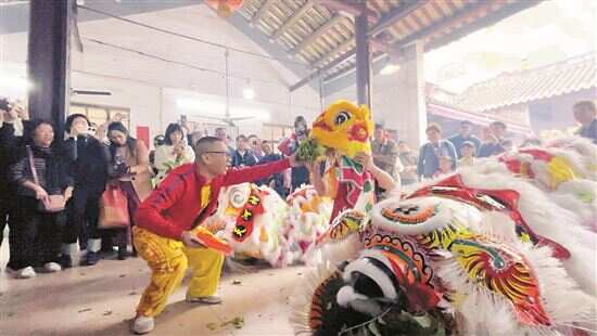 ■三元里村民设置采青环节,热情欢迎来自天河一支醒狮队中的小醒狮。