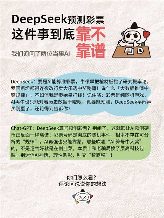 新快报讯 记者陆妍思 通讯员关言报道 近日,一位网友发帖称,自己用DeepSeek推荐的号码来买彩票中奖了引发了不少关注,相关话题登上微博热搜。对此,中国体育彩票官方微信发文提醒公众,再强大的AI也无法预测中奖号码。