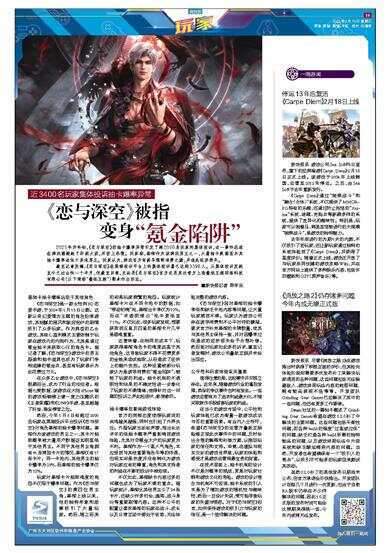 《恋与深空》因对秦彻的抽卡爆率低和缺乏卡池内容等问题,让大量玩家感到不满。玩家认为游戏公司存在诱导消费和不公平对待的嫌疑,要求官方补充秦彻的卡牌数量,使其与其他男主保持一致,并对因爆率过低造成的经济损失给予合理补偿。然而面对玩家如此多的诉求,截至记者发稿时,游戏公司叠纸互娱并未给出回应。