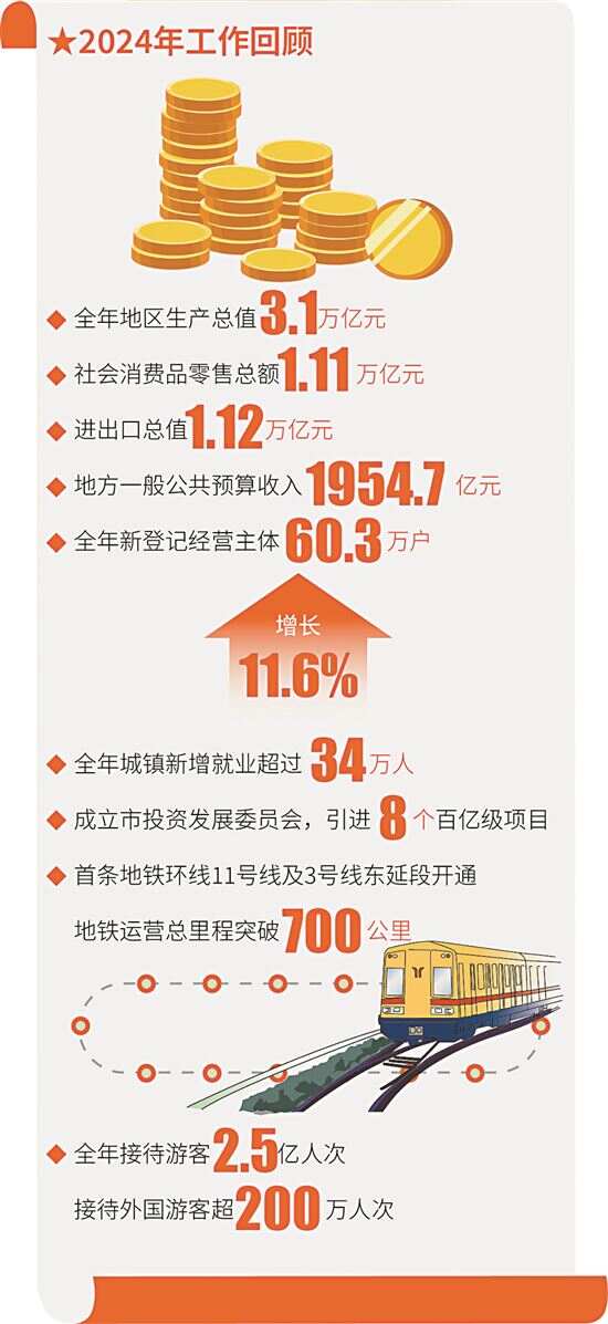 报告指出,2024年全年地区生产总值3.1万亿元、增长2.1%,实现稳中有进;固定资产投资8638.1亿元,创历史新高;社会消费品零售总额1.11万亿元、商品进出口总值1.12万亿元,保持“双万亿、双增长”势头;地方一般公共预算收入1954.7亿元、增长0.5%,较好支撑发展大局。