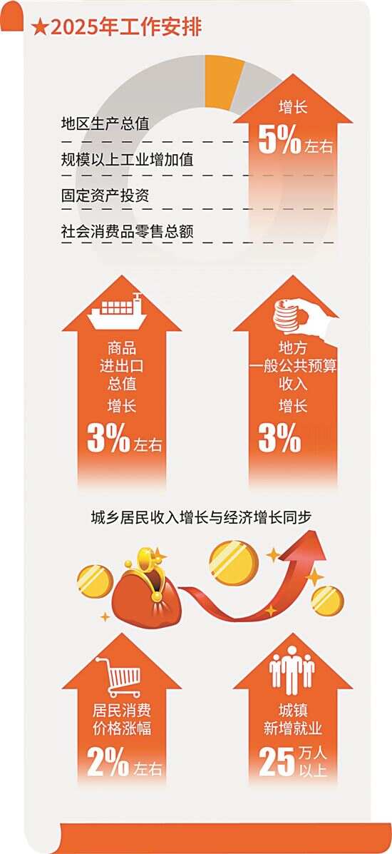 今年经济社会发展的主要预期目标是:地区生产总值、规模以上工业增加值、固定资产投资、社会消费品零售总额增长5%左右,商品进出口总值增长3%左右,地方一般公共预算收入增长3%,城乡居民收入增长与经济增长同步,居民消费价格涨幅2%左右,城镇新增就业25万人以上。
