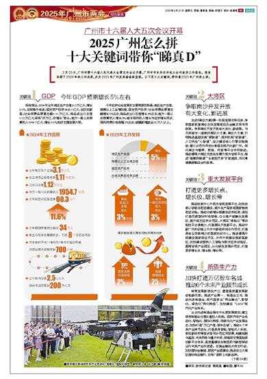 2月20日,广州市第十六届人民代表大会第五次会议开幕,广州市市长孙志洋向大会作政府工作报告。报告回顾了2024年的工作成果,并为2025年广州发展描绘新蓝图。以下是十大关键词,带你看2025年广州怎么拼。