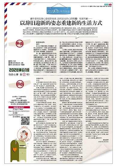 本期“202心事咨询室”的来信者是第二次写信给华南师范大学心晴热线负责人袁杰。去年,来信者无法接受母亲意外受伤多次手术的事实,是袁杰的回信让对方重拾生活的勇气。然而,随着时间流逝,母亲对于大腿的伤却越来越在意,害怕身体变差、害怕他人异样的眼光,深陷在负面的情绪之中,这令孩子心疼不已。对此,袁杰用王菲在春晚中演唱的歌曲《世界赠予我的》、大热电影《哪吒2:魔童闹海》中石矶娘娘为来信者和受伤的母亲开解:日常生活中虽有磨难,但依然充满着平淡快乐。