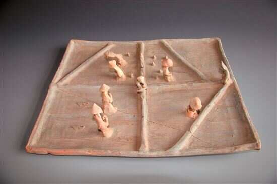 广州番禺龟岗M16也出土了方形汉代“陶水田”,现藏番禺博物馆,四周及中间有高起的“田”字形埂。田中有7个戴笠俑,或低头,或弯腰,表现出插秧的劳作场面。