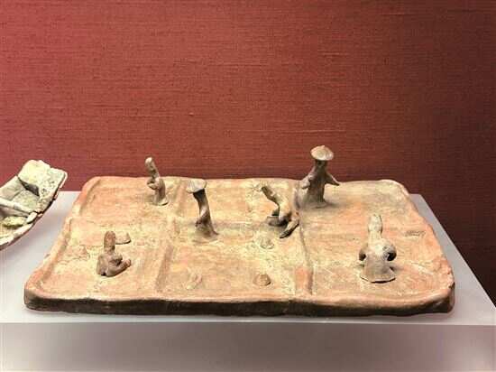 记者在广东省博物馆的展厅里,看到了一件汉代泥质红陶的“陶水田附船”的模型。井字形的水田被划分为六方,五方田面刻水波纹,一方田面为点纹,每方有一陶俑在劳动。其中还有一陶俑坐在田埂上。右上角陶俑戴斗笠,双手作手扶姿势;右下角陶俑执镰做收割状;坐在田埂上的陶俑似乎在磨镰刀;在他正前方的那方俑则做扶犁状,田面还有一犁头冒出,生动有趣;左上陶俑站立,似乎在清点插过的秧苗;左下方的陶俑则直接坐在田里,看起来像在捆绑稻草。