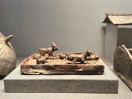 现藏广东省博物馆有一件东汉陶牛棚,呈四方半遮状,中间有柱,柱旁站一人俑,正在给牛喂食,器内较大两头牛俑应为一公一母,带着一大两小的幼牛俑绕着柱与人俑转圈,场景十分有生活味。
