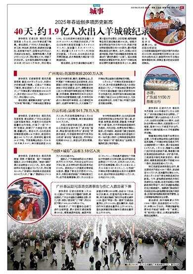 新快报讯 记者王彤 通讯员交通宣报道 2月22日,2025年春运落下帷幕。春运期间,广州市人员流动量大,务工流、学生流、探亲流、旅游流交织叠加,客流稳中有升,自驾车出行仍占人员流动主体地位。离穗和抵穗人员累计约1.9亿人次,同比增长4.5%,突破了历史纪录。全市高快速路网车流量(不含过境)约8601.5万车次,同比增长5.5%。白云机场单日旅客发送量(1月25日13.9万人次)突破历史纪录,广州白云站单日旅客到发量(2月4日11.0万人次)、发送量(1月25日7.7万人次)、到达量(2月4日7.5万人次)均创历史新高。1月23日,白云机场正式启用第四跑道,成为粤港澳大湾区首个四跑道机场。