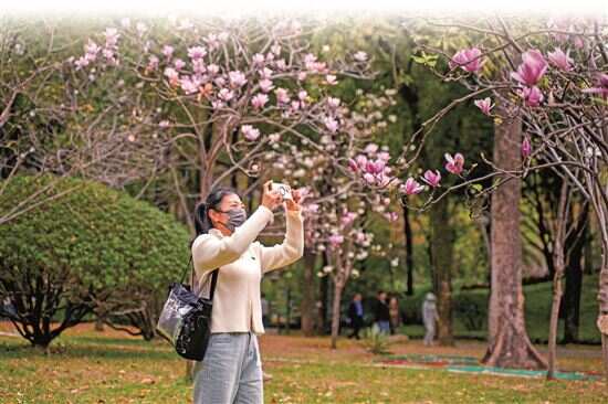 ■又是一年春,羊城百花开,在珠江公园,绽放的玉兰花吸引不少市民游客打卡。