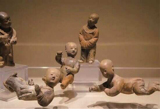镇江博物馆曾展出苏州制的5个人偶“摩喝乐”泥塑,这些泥偶1980年出土于镇江原五条街小学。此泥塑经烧制属于低温陶之类。素胎,略施彩绘,高约10厘米。所塑造的儿童生动自然,憨态可掬。至宋代,无论是在雕塑还是在绘画方面,以儿童为题材的文艺作品比过去更加丰富。工商业的发达,形成了市民社会,也促使了风俗艺术的发展。另,北京故宫所藏宋人绘《瑶台步月图》描绘的是夏夜衣着薄质纱罗登露台赏月时的情形。画中之女主人左侧,一婢女双手托盘,盘中有小人数枚,此当为“摩喝乐”。这位高冠髻,身穿小袖对襟旋袄、长裙的妇人正手执茶盏,闲适地望着盘中的人偶。此当为七夕节之情景。又及,麦积山第133窟前堂正中存有宋代重塑摩睺罗授记造像。表现的是释迦牟尼授记其子摩睺罗的情形。佛祖的手若即若离地抚慰着儿子,在其头顶瞬间停顿。此刻,则见摩睺罗双目低垂,两手合十,面含怯屈,表情复杂。这组造像的玄妙之处是对于佛祖双目的塑造。在幽暗的石窟之中,其双眼呈眯目下视之状,但若遇光线之际,顿会发现佛的眼睛忽然睁开,可以清楚地看到眼中微噙泪水,十分逼真。这种表现手法是宋人在文艺方面世俗观的体现。