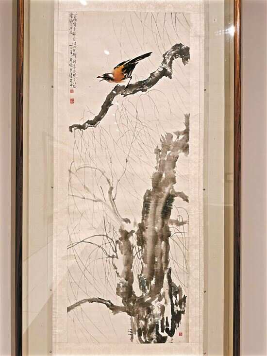在广东美术馆新馆展出的“往来千载一悲鸿:徐悲鸿诞辰一百三十周年纪念展”中,有两幅画引起了记者的注意,一幅是《秋树》,一幅是《古柳黄鹂》。两幅画都是徐悲鸿与赵少昂合作,“少昂补蝉”“少昂写黄鹂,悲鸿以古柳新枝足成之”,由此可见徐悲鸿与岭南画家关系之密切。