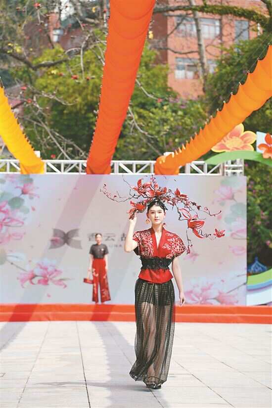 活动现场,“红棉映云裳”香云纱走秀成为全场焦点,模特身着香云纱服饰,以木棉为核心意象,结合粤港澳大湾区的代表性市花:香港的紫荆、澳门的莲花等,为观众呈现出一场大湾区三城之花的非遗时尚盛宴。