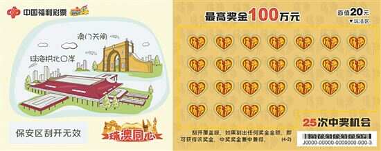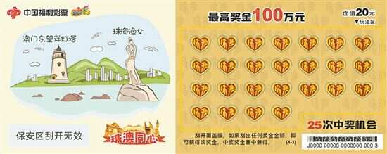 “珠澳同心”主题即开票面值20元,共25次中奖机会,最高奖100万元,全套张数4张。刮开覆盖膜,如果刮出任何奖金金额,即可获得该奖金。中奖奖金兼中兼得。“珠澳同心”为四联游戏彩票,这款游戏设计不仅赞许了自澳门地区回归25年来,两地人民共同创建繁荣之景,也表达了未来继续同心而行共创盛世的信心。