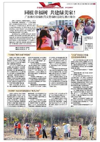 根据《广东省“绿美广东巾帼行动”实施方案》,广东省妇联、省林业局将每年3月份设为“广东省巾帼植树月”,在全省上下共同开展“同植幸福树 共建绿美家”植树活动。