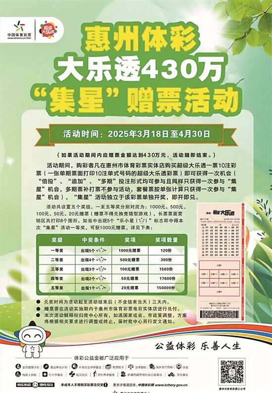 新快报讯 记者陆妍思 通讯员惠州体彩报道 为回馈广大购彩者的支持与厚爱,惠州市体育彩票中心从即日起推出大乐透430万元“集星”赠票活动,本次活动将一直持续至4月30日。
