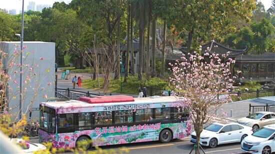 值得一提的是,在海珠区文广旅体局指导下,广州公交集团下属巴士集团一分公司联合海珠湿地,特别推出250路赏花专线主题定制巴士,以“花开湿地间 城央有桃源”为主线展开视觉叙事,车身绘满宫粉紫荆与樱花,花瓣随车身流线型设计轻盈飘动,在阳光下折射出渐变光晕,营造“车行花浪涌”的动态美感,乘客透过车窗可沉浸式体验“花海”。