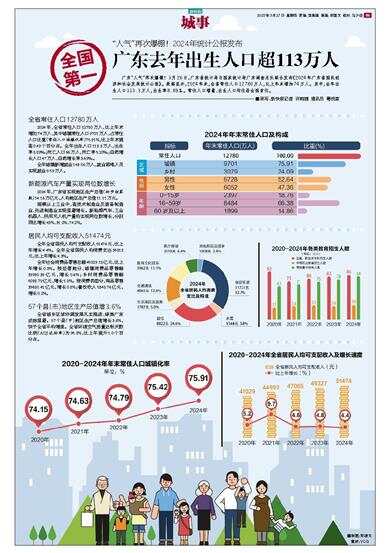 广东“人气”再次爆棚!3月26日,广东省统计局与国家统计局广东调查总队联合发布《2024年广东省国民经济和社会发展统计公报》。数据显示,2024年末,全省常住人口12780万人,比上年末增加74万人。其中,全年出生人口113.3万人,出生率8.89‰。常住人口增量、出生人口均位居全国首位。