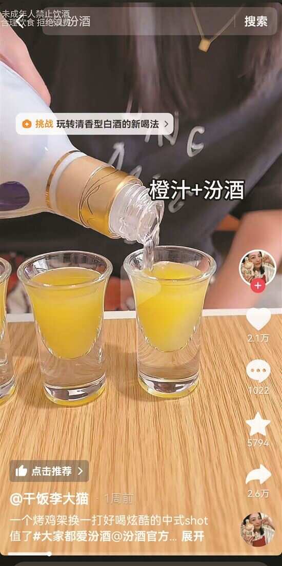 谁说白酒只能传统?年轻人的脑洞绝了!这届网友把汾酒玩出了新高度:全民共创的热潮下,涌现出汾酒的多种“神仙喝法”:话梅+汾酒45ml+菠萝汁;汾酒+蜜桃汁;葡萄+汾酒+气泡水,轻盈口感,混合双香。更有汾酒+可乐的新奇搭配,伴随柠檬片的加入,醇香与甜美在舌尖碰撞……花样频出的创意特调,在国内最大的短视频社交平台上,使得汾酒正在成为更多年轻一代的“热爱”。