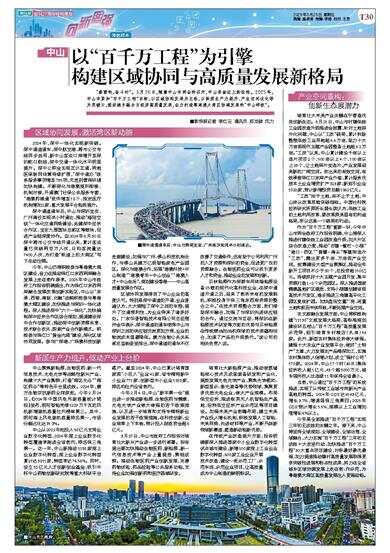 2024年,深中一体化实现新突破。深中通道通车,深中航空港、跨市公交专线同步启用,新中山客运口岸增开至深圳蛇口航线,深中交通一体化水平明显提升。深中公积金实现互认互通,两地医保联网结算持续扩围,“深中通办”政务服务事项增至735项,无差别营商环境加快构建。不断深化与港澳规则衔接、机制对接,开通澳门社保公共服务专窗,“港澳药械通”批件增至18个、指定医疗机构增加2家,重大发展平台能级提升。