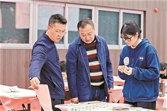 赛场内,参加书法项目的选手们,提前开好笔、折好纸,静静等待比赛开始;选择篆刻项目的选手们,正襟危坐,在篆刻石上画好格子,随时准备开始。下午3点,开赛信号一发出,大家或执毛笔,或举刻刀,楷书、隶书、篆书……各挥所长。