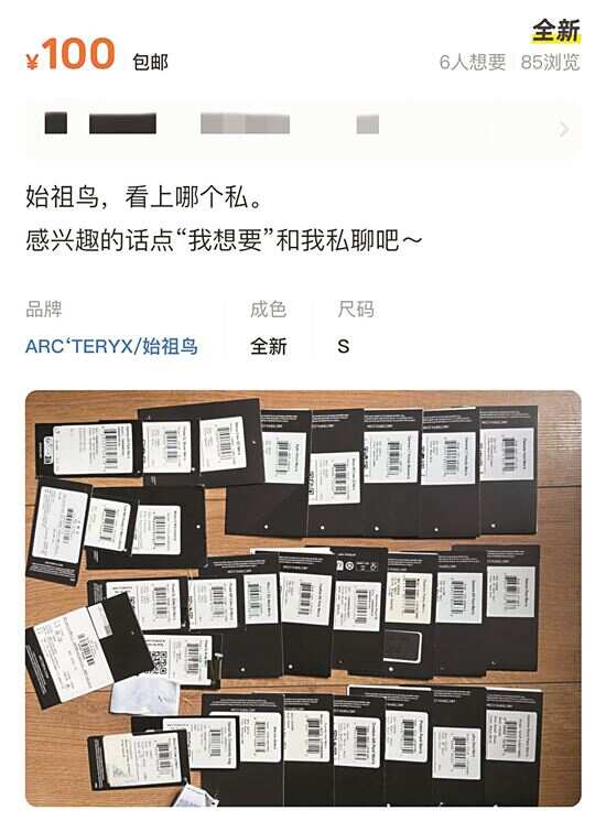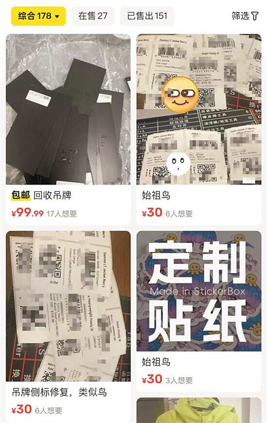 近日“始祖鸟吊牌被炒到300元一张”的话题登上热搜,许多平台已对相关搜索结果进行了屏蔽处理。记者在某知名二手交易平台上搜索“始祖鸟吊牌”,已不见相关商品。然而,更换关键词如“鸟卡”或“鸟牌”进行搜索,仍能找到不少吊牌售卖信息,其中既有出售者,也有专门收购始祖鸟吊牌的商户。