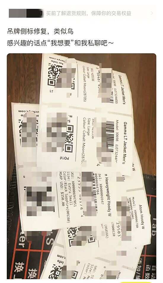 近期,有消费者向记者反映,部分商家在二手交易平台或社交平台上频繁发布始祖鸟吊牌的出售与收购信息。这些吊牌因稀缺程度不同,价格差异显著。其中,普通产品卡的收购价在5到10元,出售价则在20到50元;科技卡的收购价为20到50元,出售价可高达100到200元;而部分稀有系列吊牌,价格更是飙升至300到500元一张。