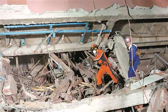 ■3月30日,在缅甸曼德勒,中国救援队队员在长城饭店开展救援。新华社发